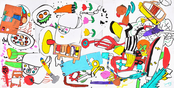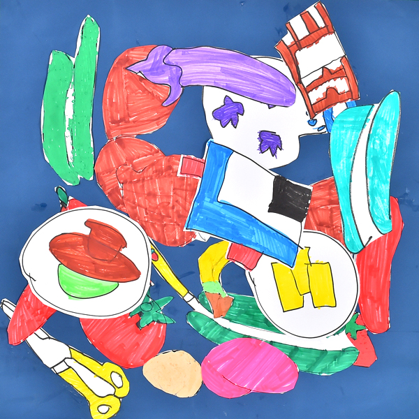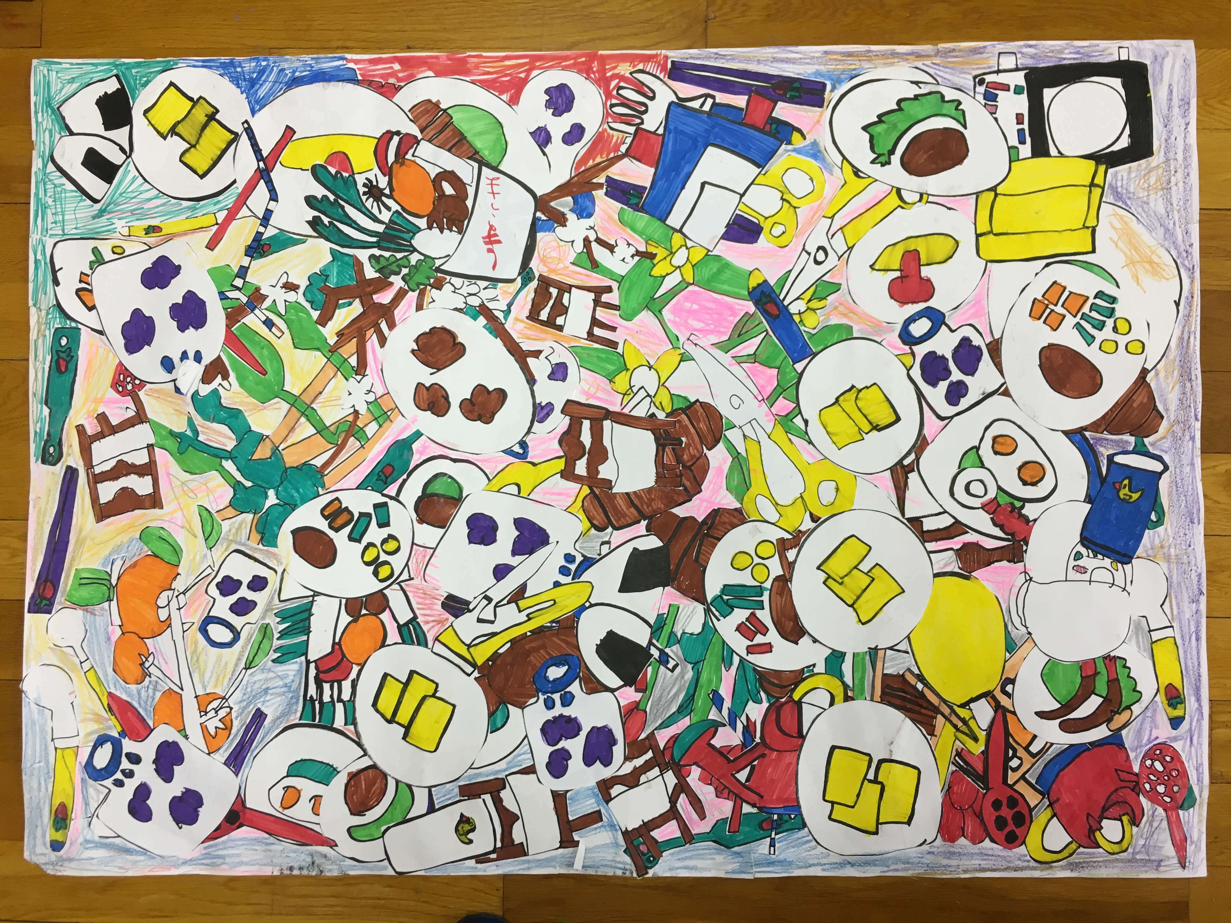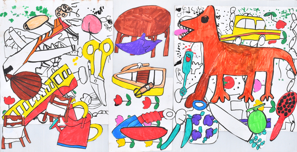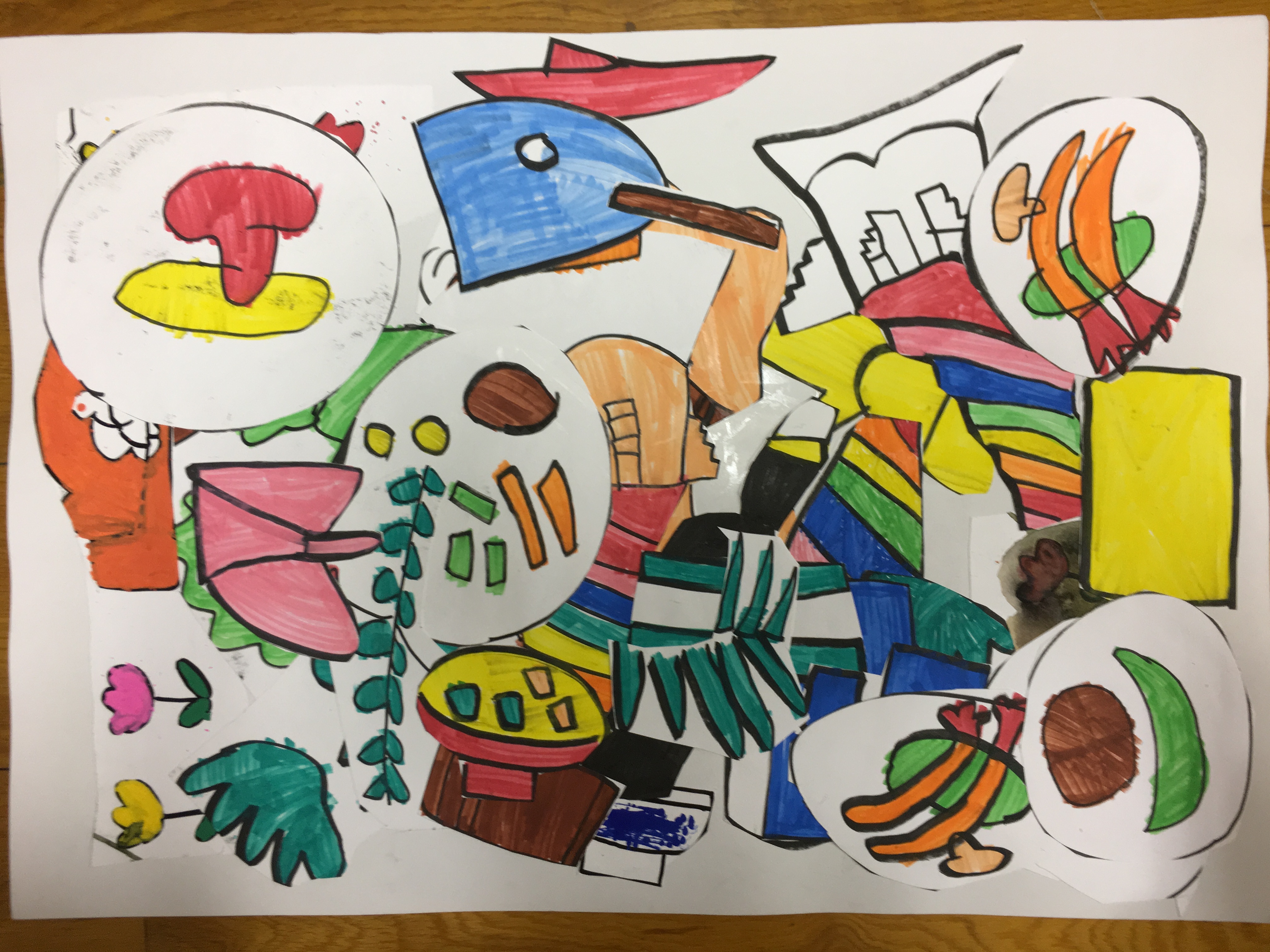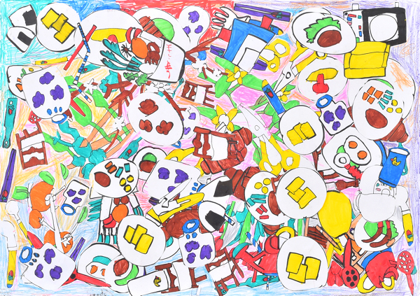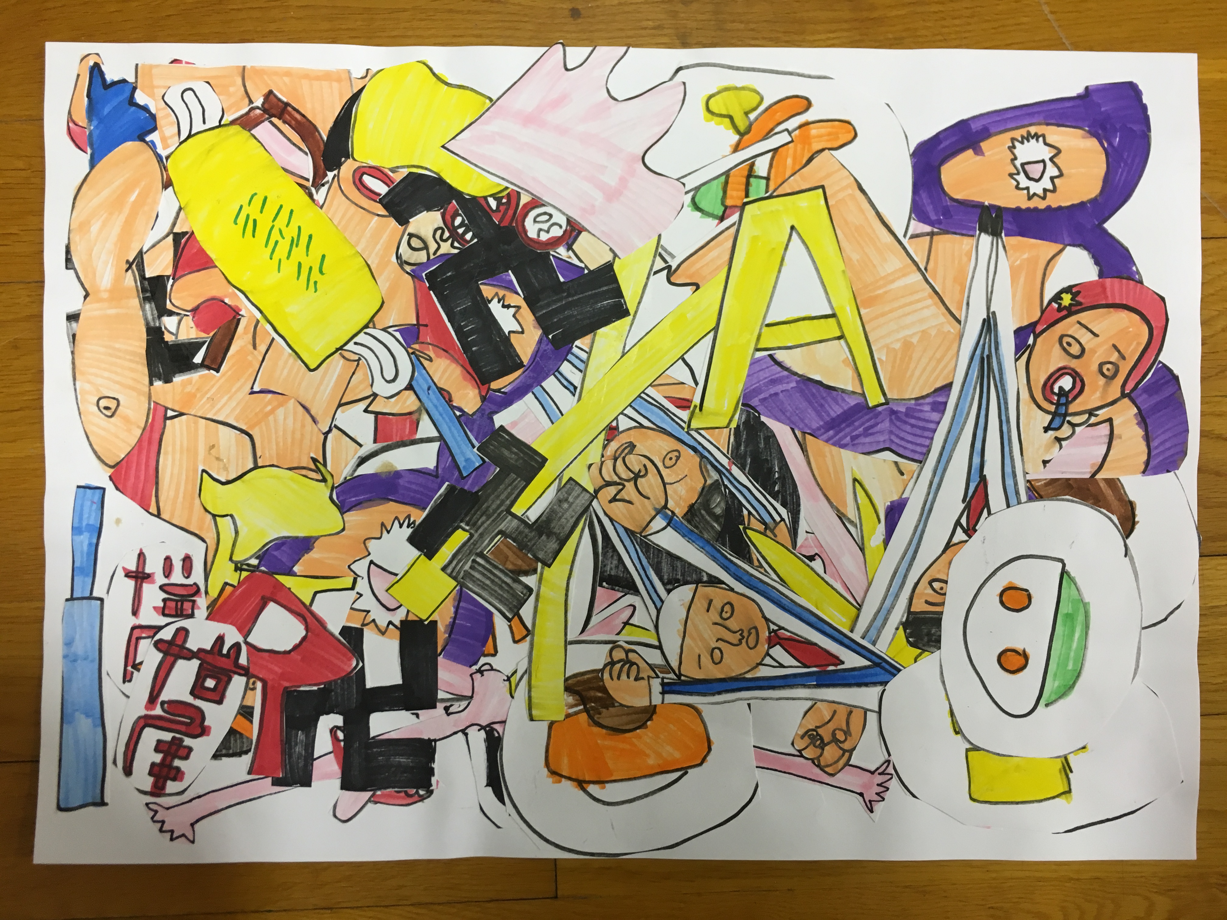 絵画教室に通い始めた頃は、絵の具を画用紙一面に塗ったりしていましたが、いつの頃からか絵カードの絵を画用紙に描き、それを台紙に貼っていくスタイルが確立しました。彼の描く絵はとこかデフォルメされていて、彼独自の見え方があるのだろうと思います。また、絵を無造作に貼っているように見えるのですが、彼なりの表現があるのでしょう。