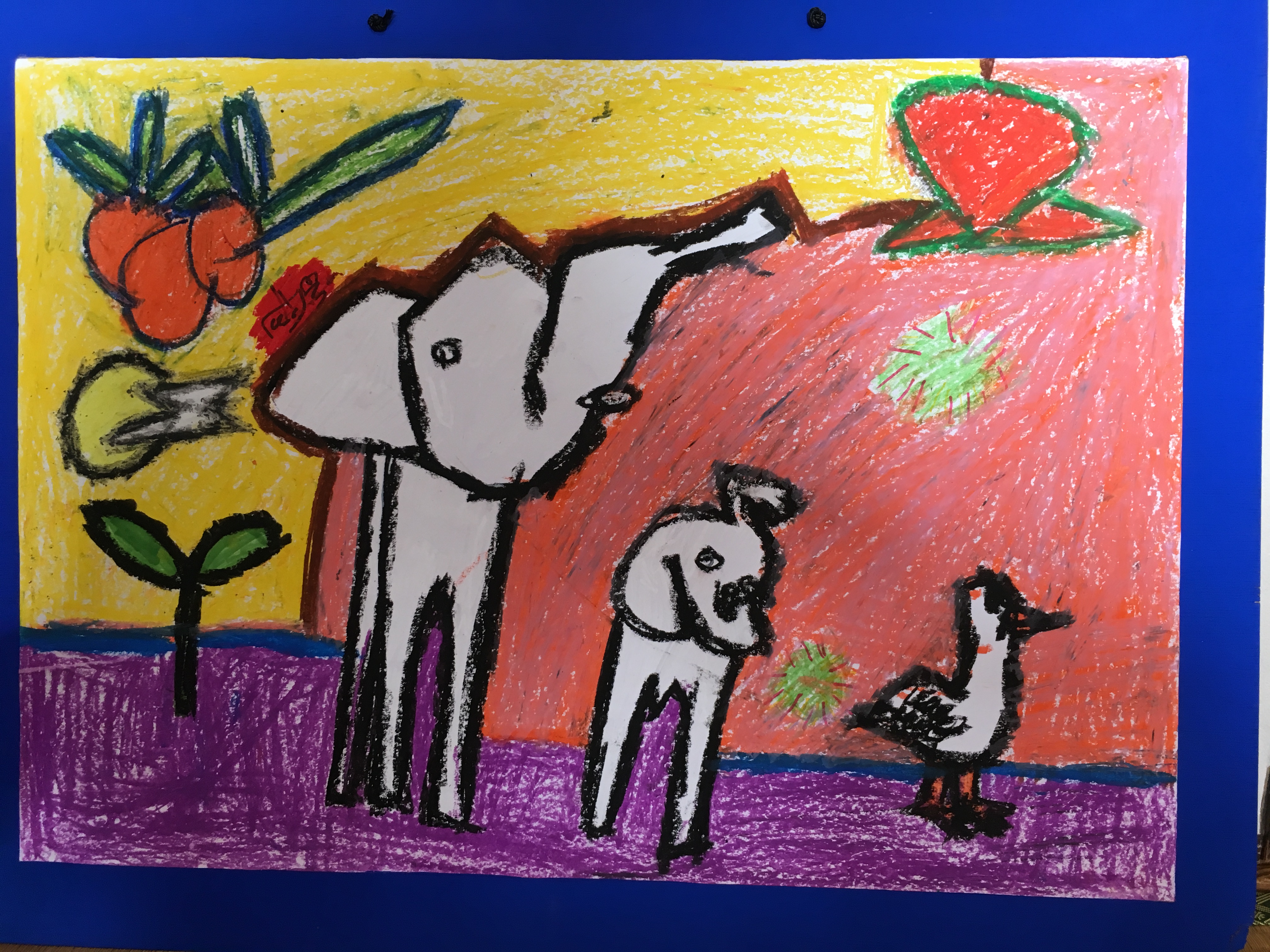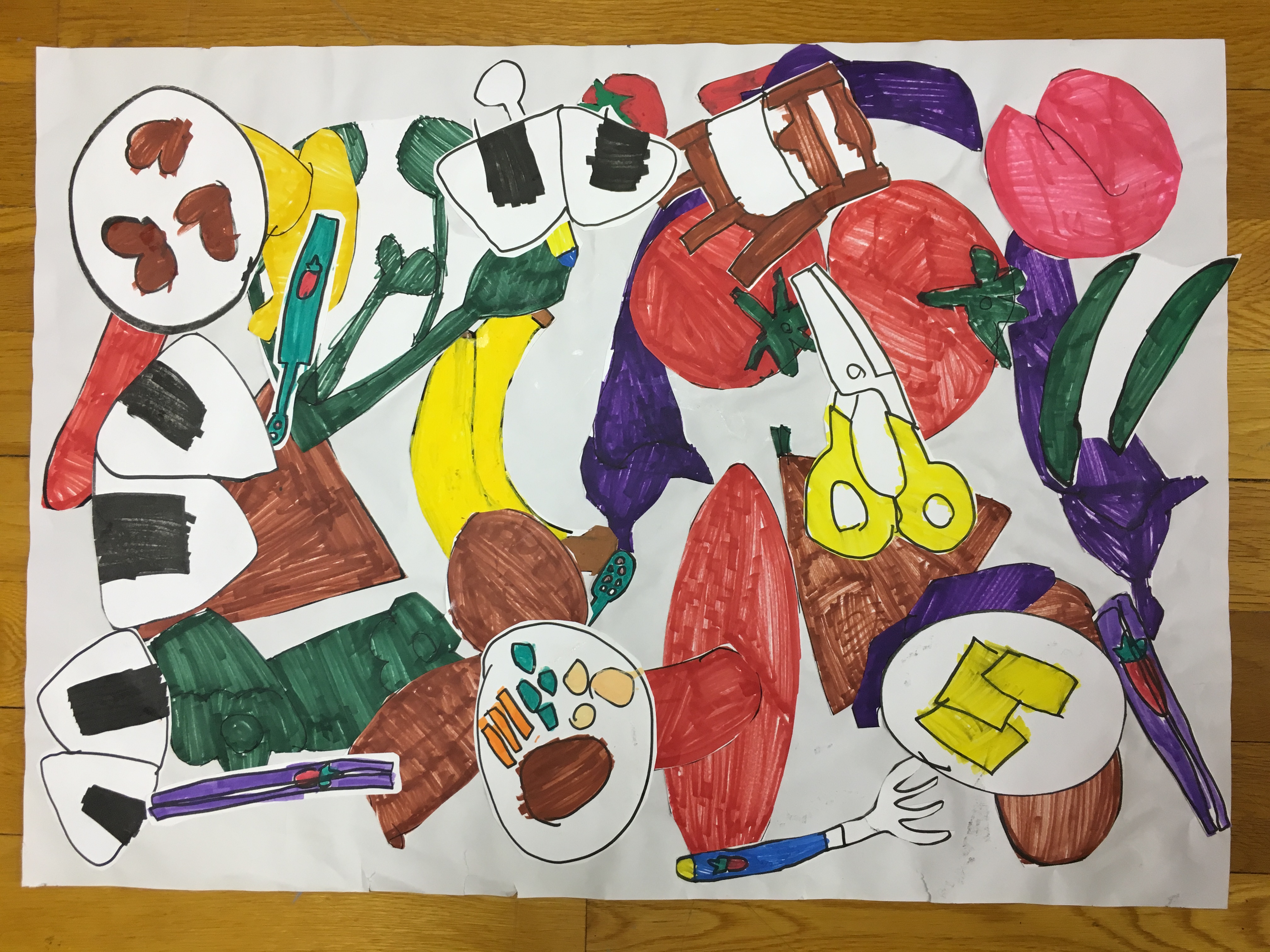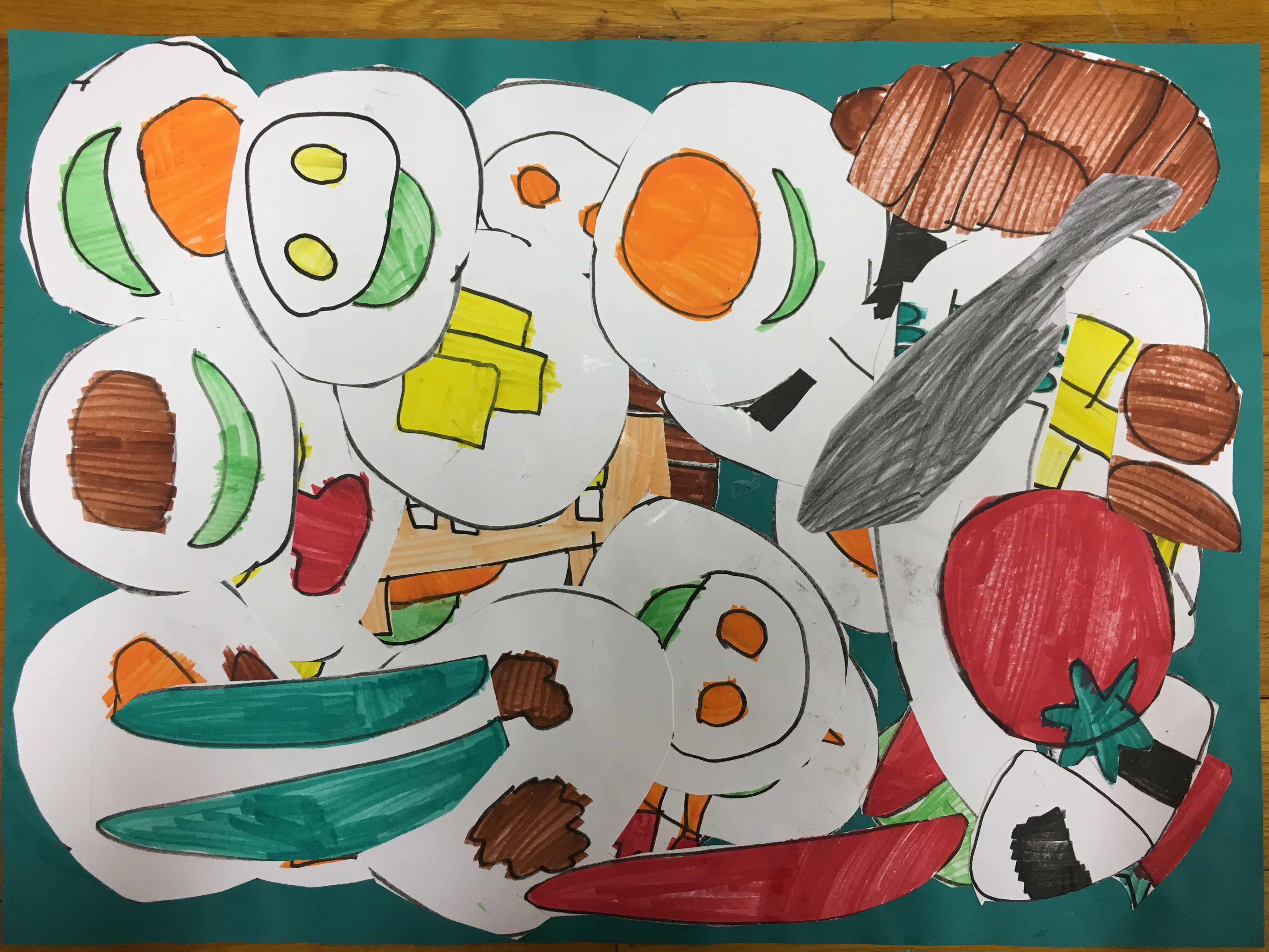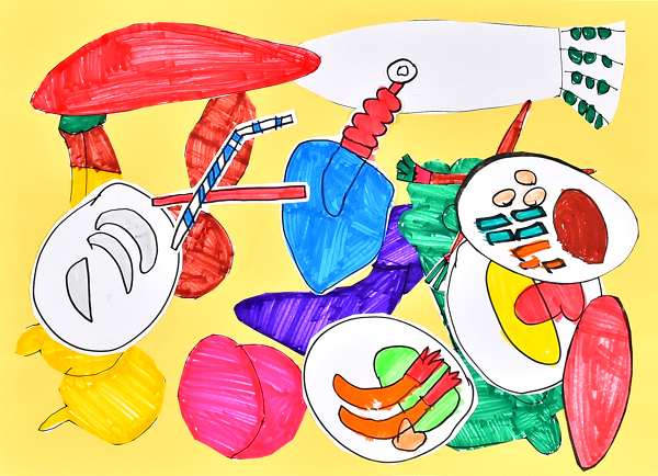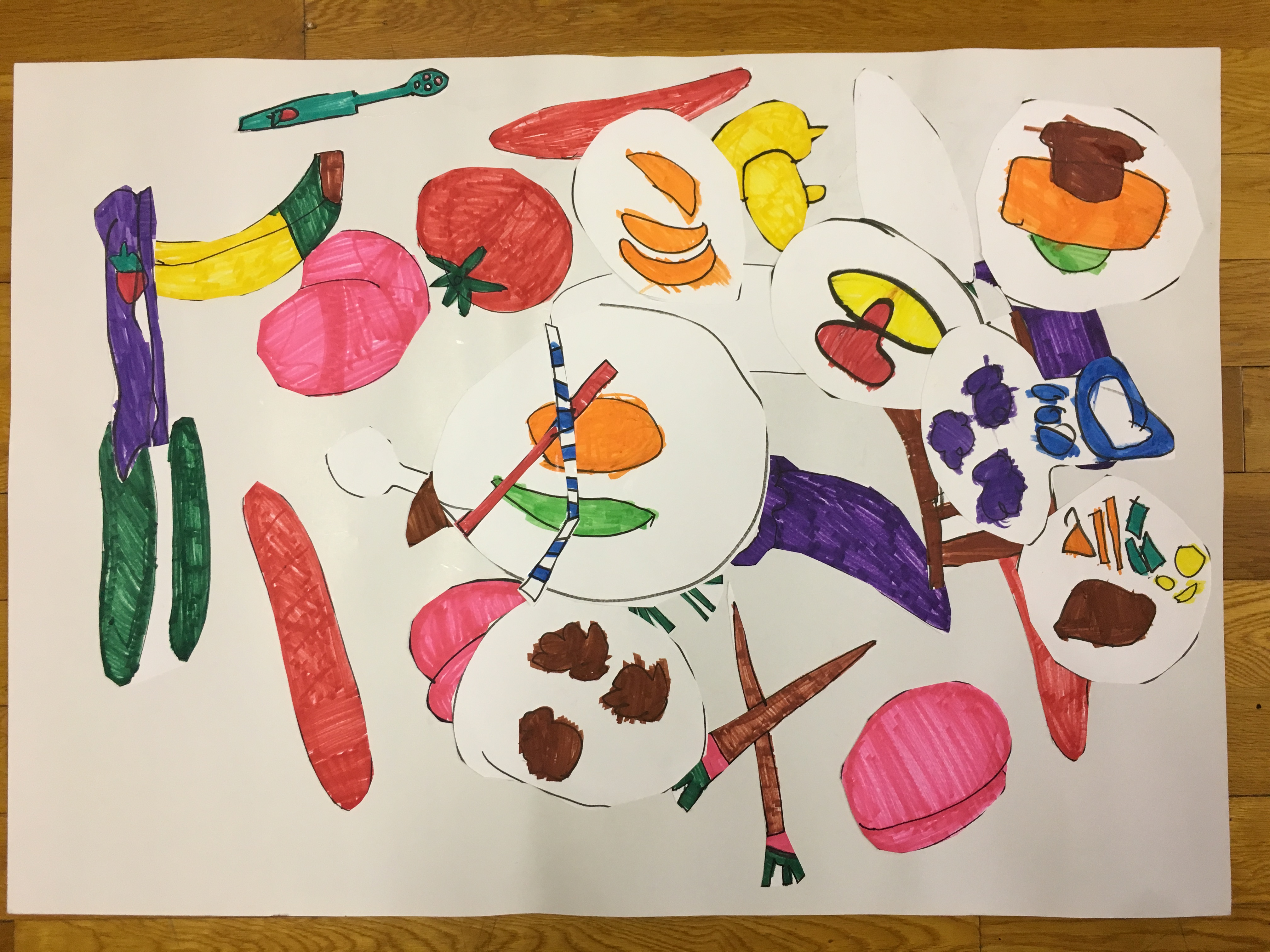 絵画教室に通い始めた頃は、絵の具を画用紙一面に塗ったりしていましたが、いつの頃からか絵カードの絵を画用紙に描き、それを台紙に貼っていくスタイルが確立しました。彼の描く絵はとこかデフォルメされていて、彼独自の見え方があるのだろうと思います。また、絵を無造作に貼っているように見えるのですが、彼なりの表現があるのでしょう。