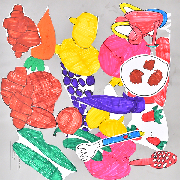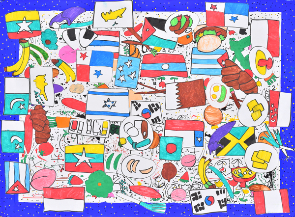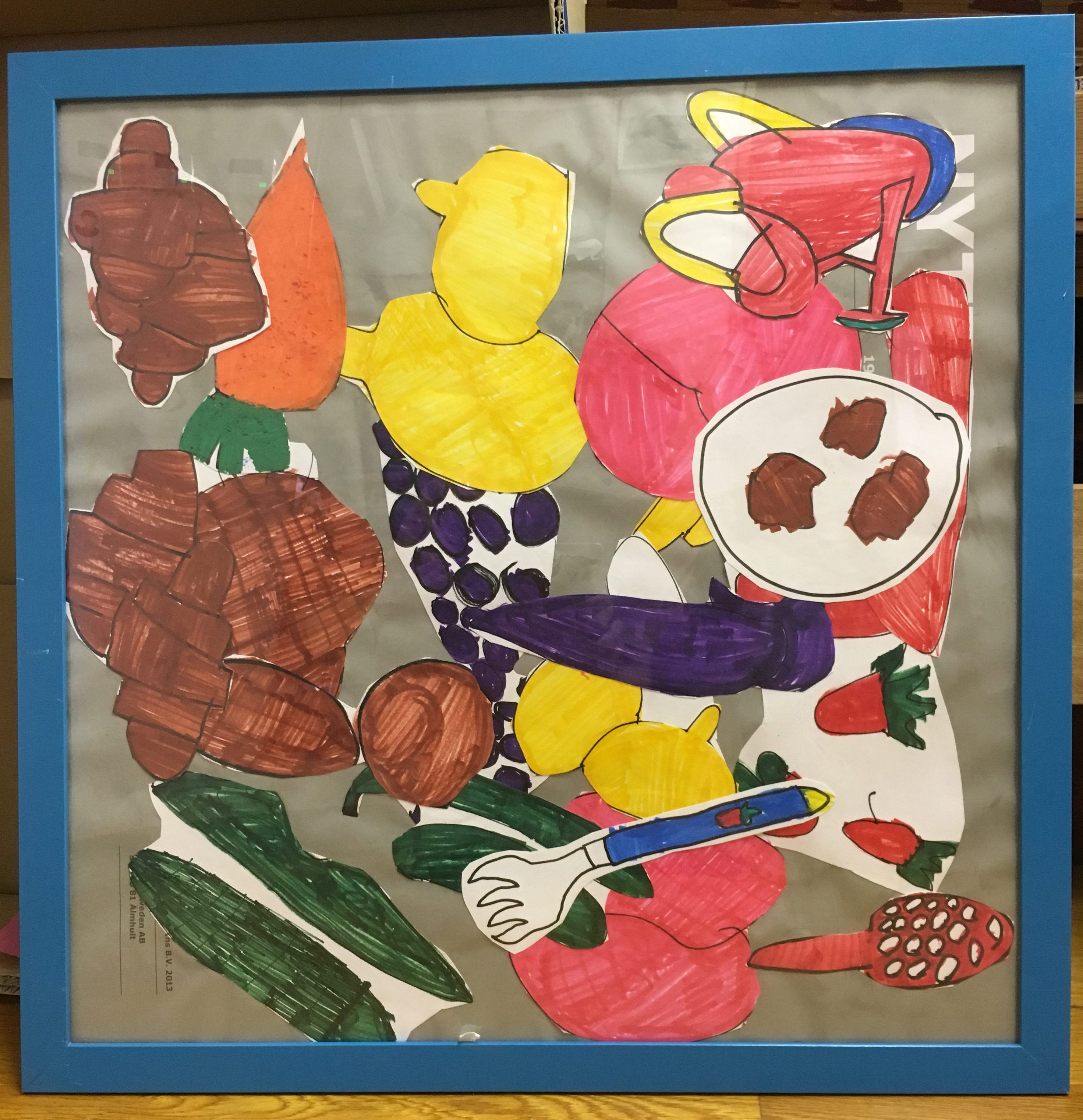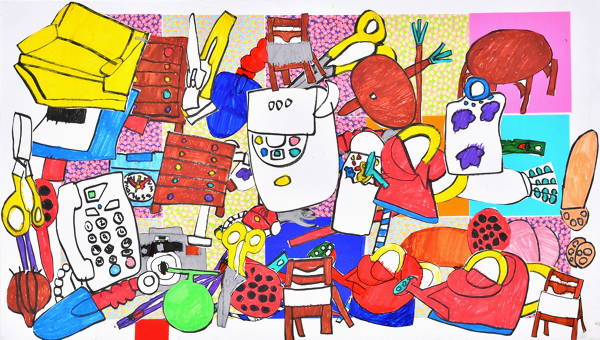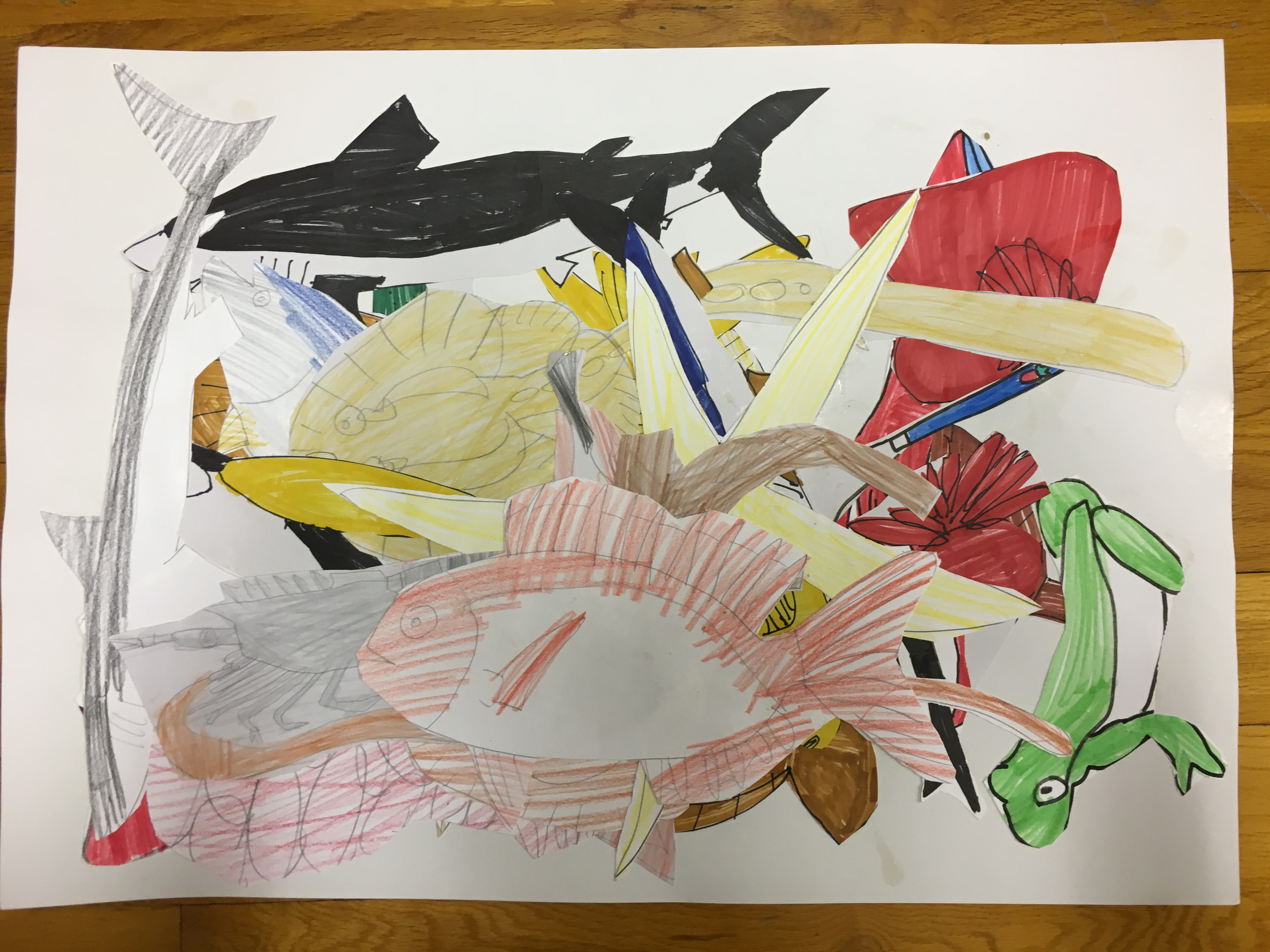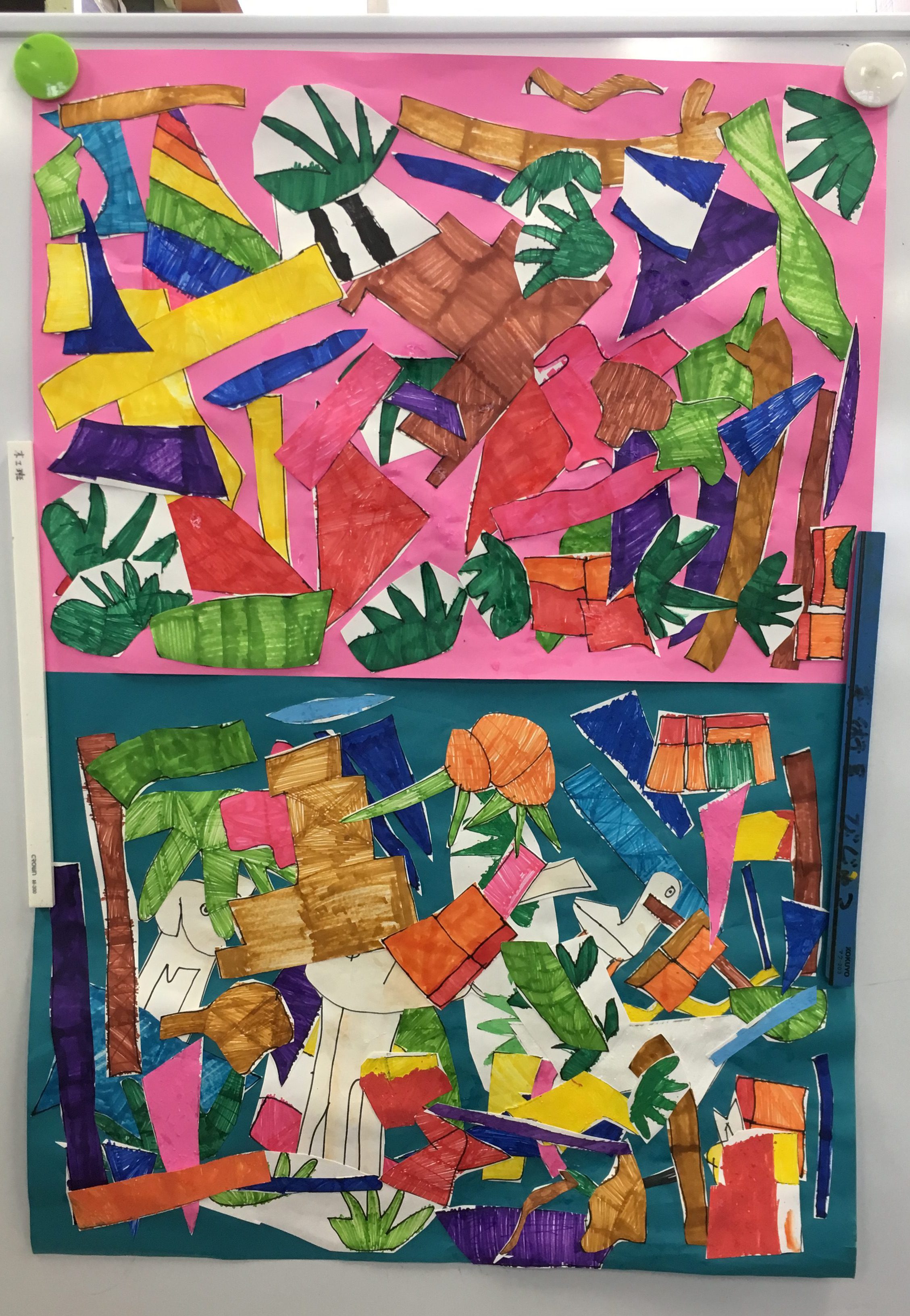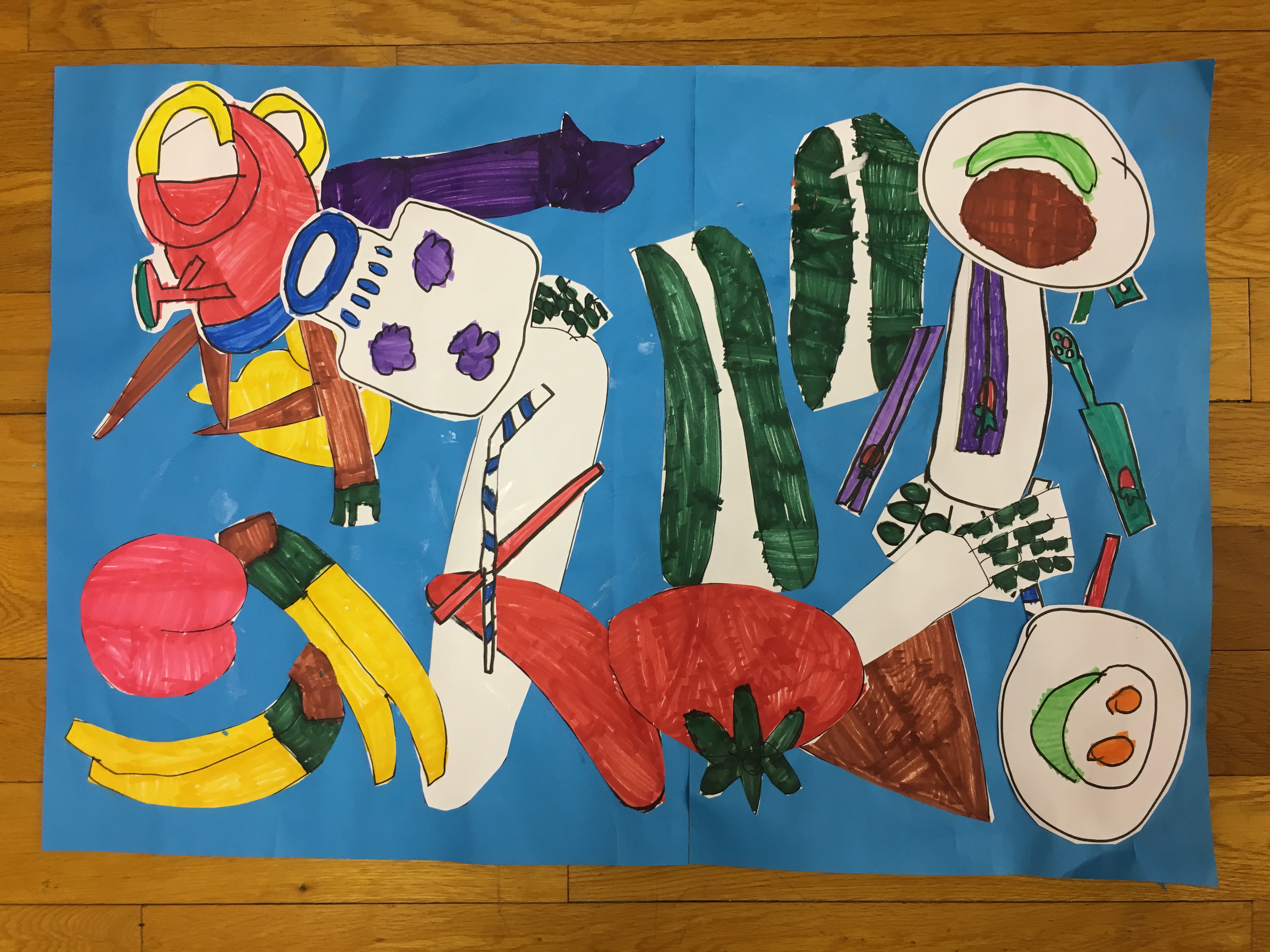絵画教室に通い始めた頃は、絵の具を画用紙一面に塗ったりしていましたが、いつの頃からか絵カードの絵を画用紙に描き、それを台紙に貼っていくスタイルが確立しました。彼の描く絵はとこかデフォルメされていて、彼独自の見え方があるのだろうと思います。また、絵を無造作に貼っているように見えるのですが、彼なりの表現があるのでしょう。